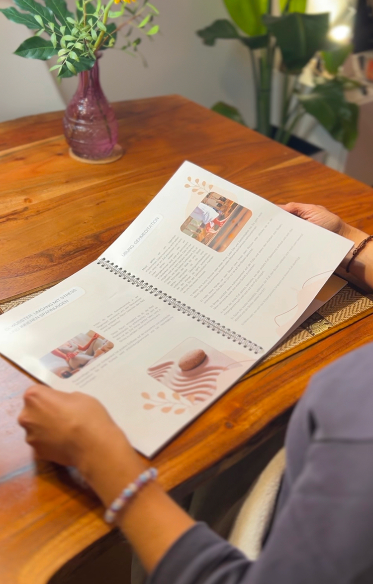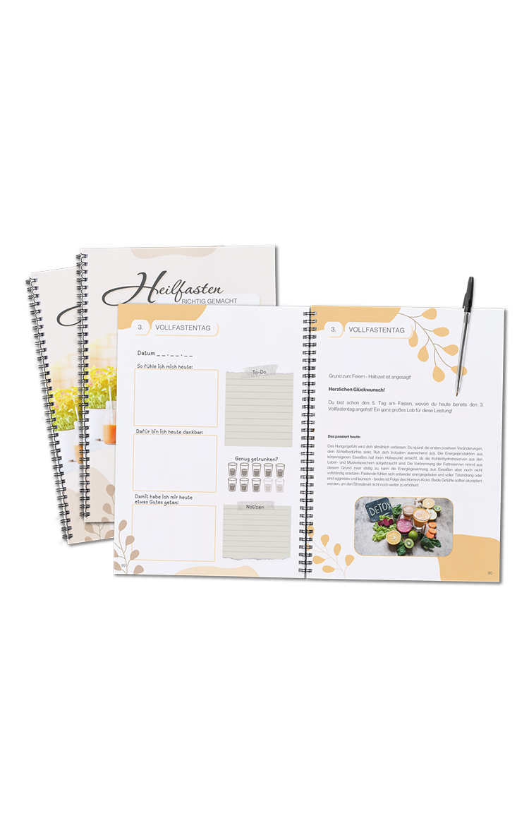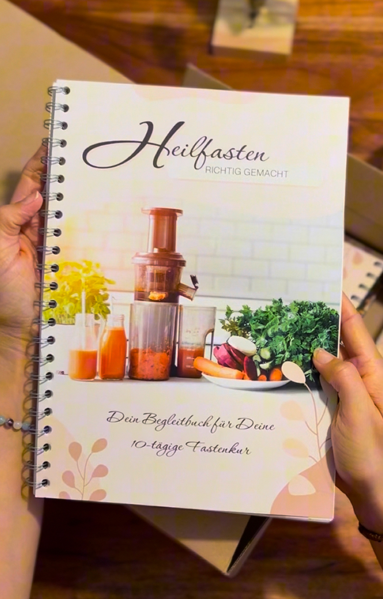 Du bekommst eine 138-seitige Anleitung mit Fastenplan, Checklisten, Tagesimpulsen, Rezepten, Yoga- und Atemübungen, Reflexionsseiten und vielen ganzheitlichen Tipps für deine Fastenreise.